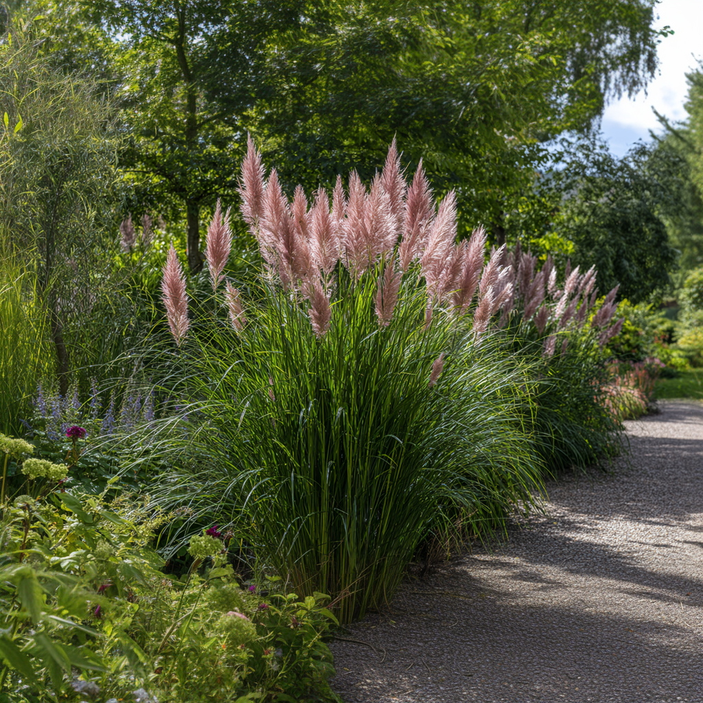 ‘Cortaderia selloana Rosea’ combineert prachtig met andere grote siergrassen en vaste planten.