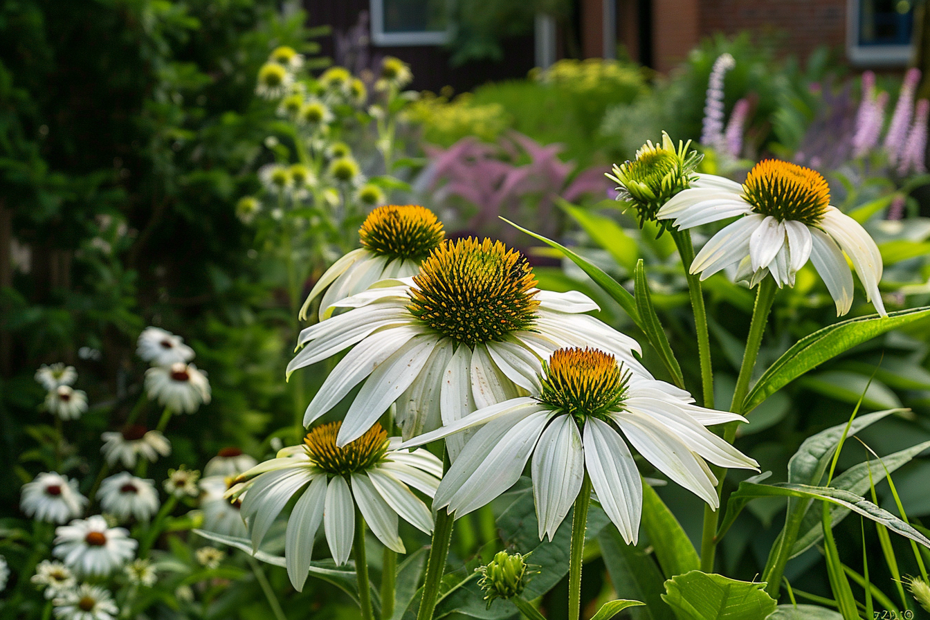Echinacea 'White Meditation' laat zich prachtig combineren met kleurrijke zomerbloeiende planten en siergrassen.